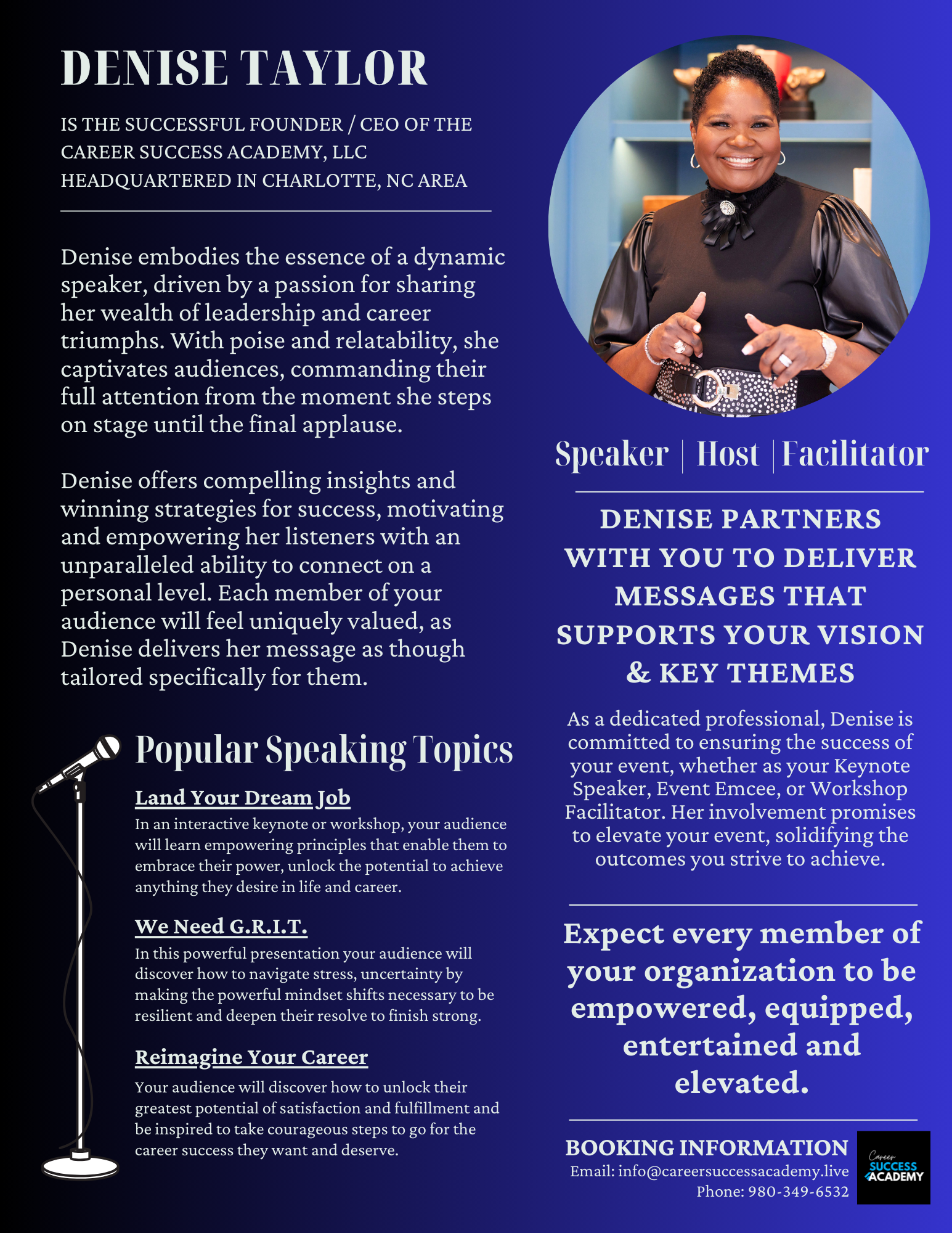 By using proven strategies and tailored guidance, Denise has assisted numerous women in conquering self-doubt, developing a fearless mindset, and taking bold steps in their life, career and business.