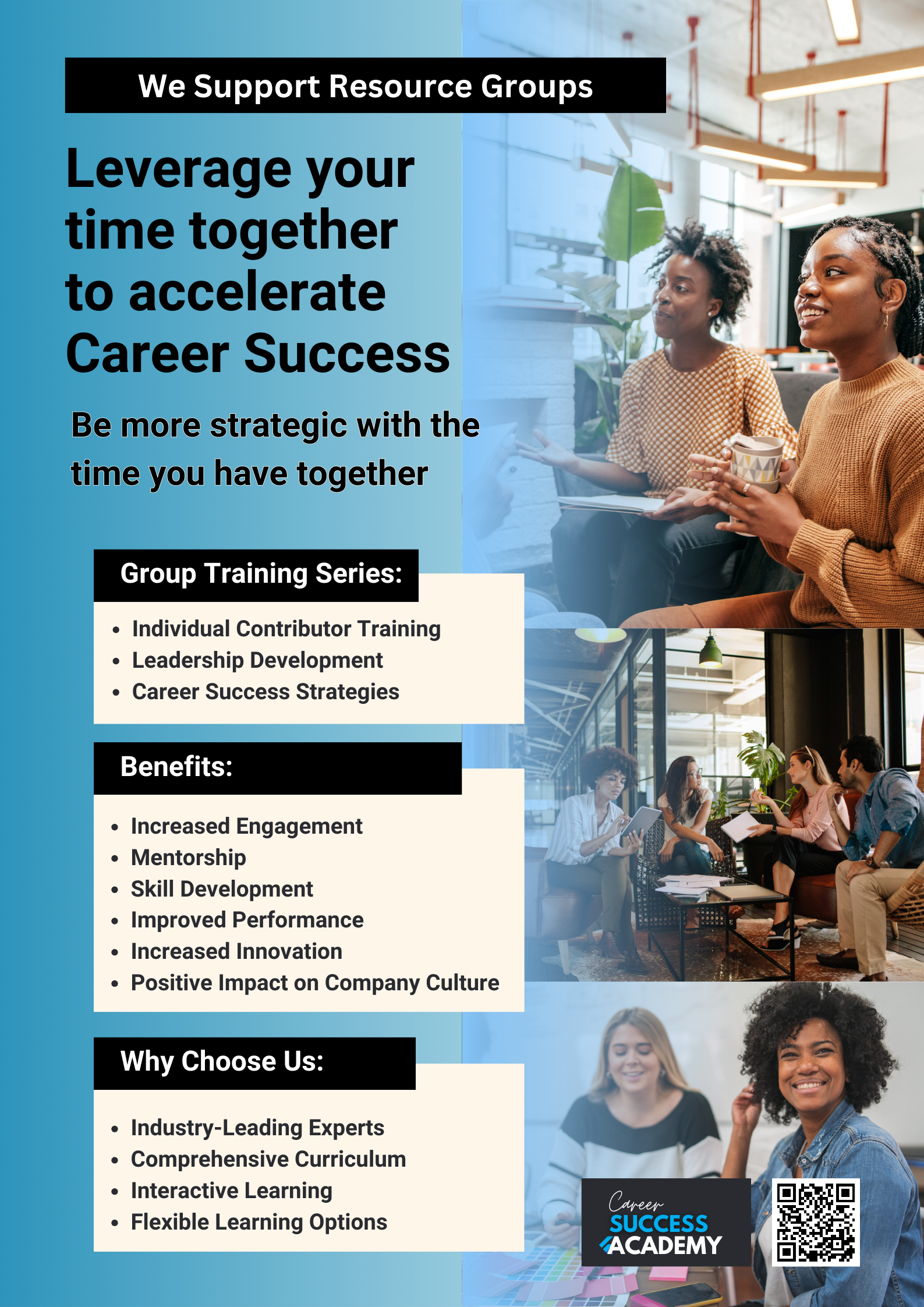 At the Career Success Academy, we thrive on collaborating with employee resource groups, seamlessly integrating career success strategies into their core values and activities, thus enriching the professional development journey for all participants.